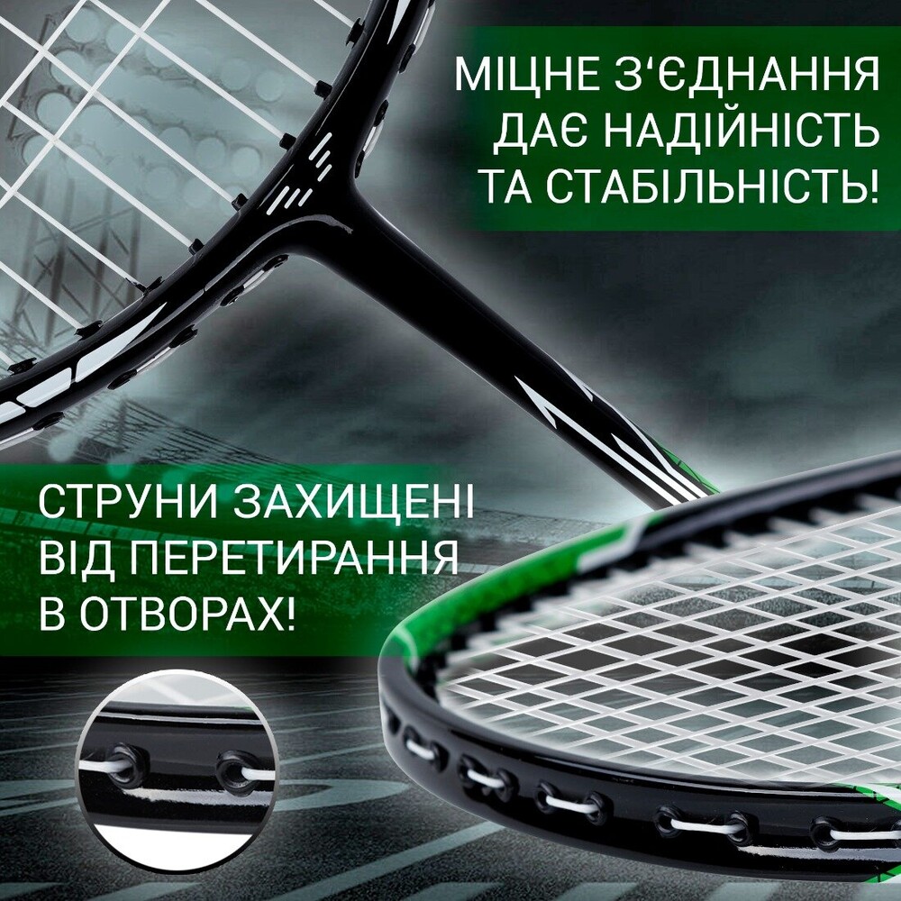 КОМПЛЕКТ – 2 ракетки, 2 нейлоновых волана, 2 дополнительные рельефные обмотки, 1 сумка.