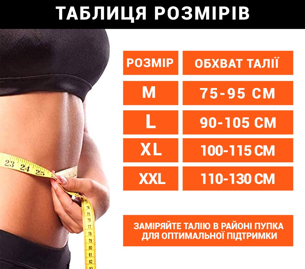 Виміряйте талію в районі пупка для оптимальної підтримки та знайдіть свої показники в розмірній таблиці: