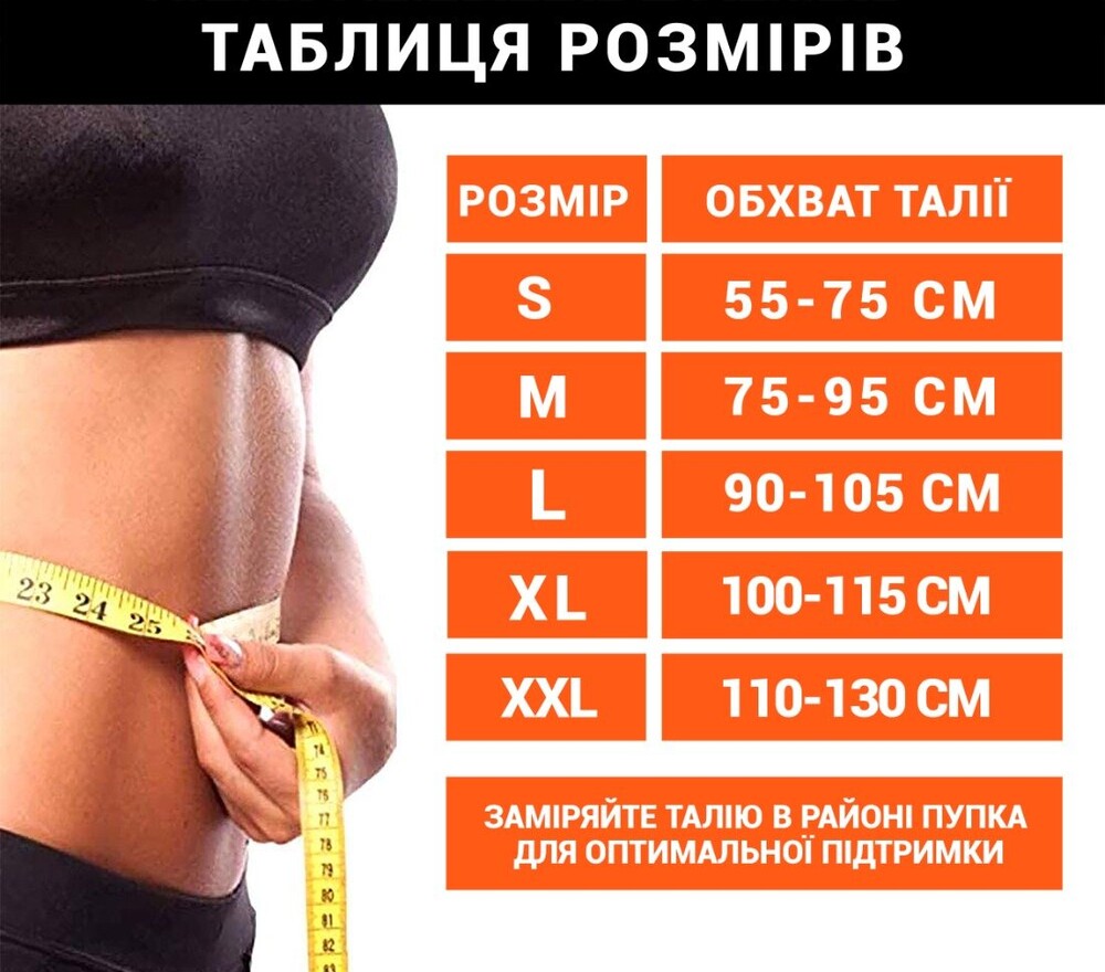 Виміряйте талію в районі пупка для оптимальної підтримки та знайдіть свої показники в розмірній таблиці: