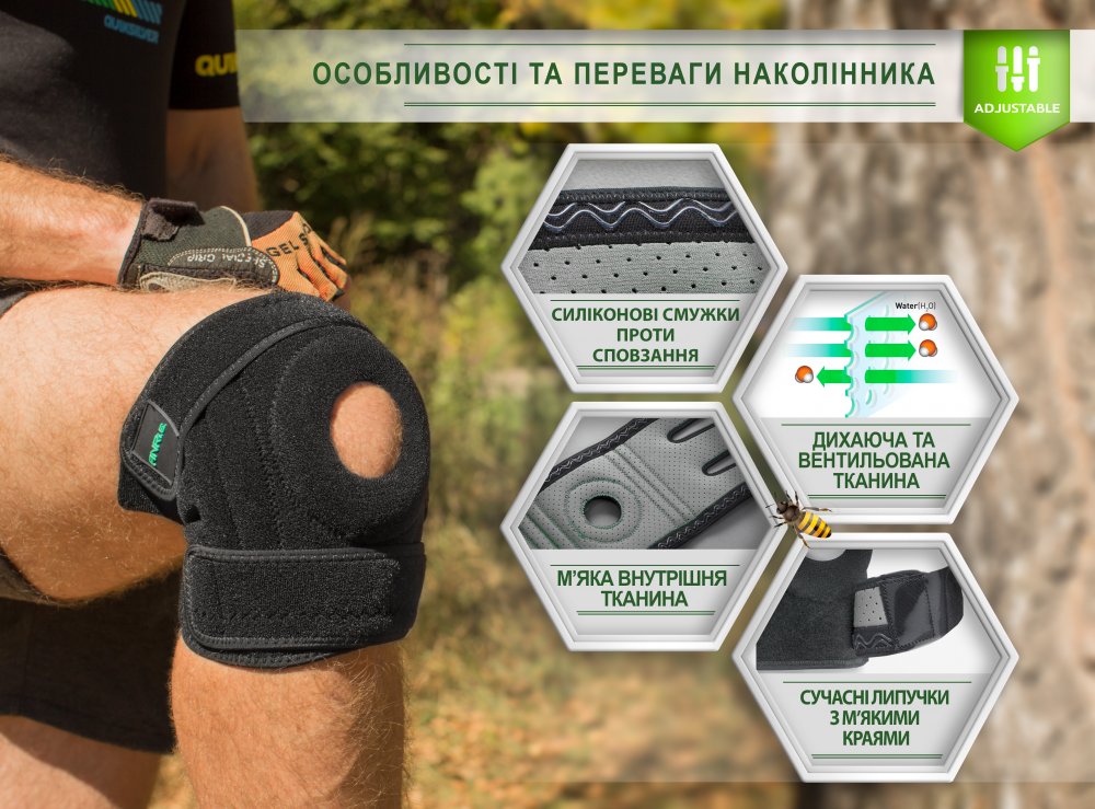 Високоякісна вентильована внутрішня тканина дозволяє наколіннику дихати, а м'яка зовнішня тканина дуже приємна на дотик і комфортна при використанні. Сучасні липучки не мають гострих кромок і колючих ворсинок, при цьому вони набагато сильніші, ніж звичайні липучки.